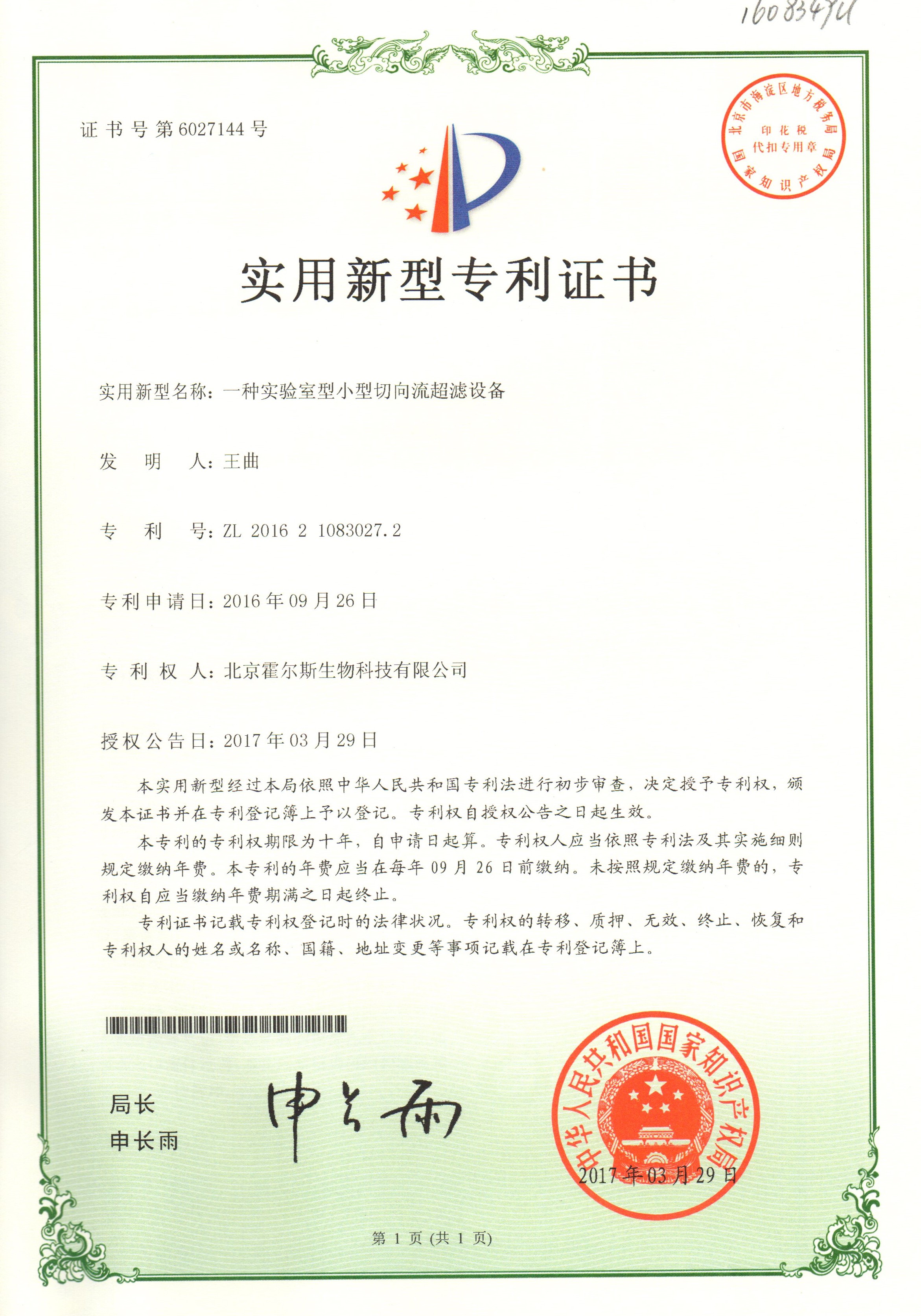 Holves obtains a patent for Tangential Flow Ultra filtration Time:2018.01.26