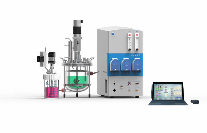 玻璃发酵罐主体采用不锈钢材料,通常采用涡轮式搅拌器。搅拌轴与罐体的连接要进行无菌密封。罐体底部设有空气分布器或喷嘴,通过空气过滤器的无菌空气从孔径几毫米的多孔管鼓入培养液内。搅拌器由置于罐顶的搅拌电机以一定的转速驱动旋转,通过搅拌涡轮产生的液体漩涡及剪切力,将鼓入的空气打碎成小气泡,并均匀分散在培养液中。这样,既提供了细胞生长所需氧,同时又使培养液浓度均匀。玻璃发酵罐的装料系数一般为70~80%。系统通常还设有消泡装置、参数测试元件、蛇管或夹套冷却装置等。