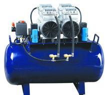 无油空气压缩机是属于微型往复活塞式压缩机,电机单轴驱动对称分布曲柄摇杆机械结构,主运动付为活塞环,副运动付为铝合金圆柱面,运动付之间由活塞环自润滑而不添加任何润滑剂。压缩机通过曲柄摇杆的往复运动使圆柱面气缸的容积发生周期性变化,电机运转一周气缸容积有两次方向相反的变化。当正方向是气缸容积扩展方向时,气缸容积为真空,大气压大于气缸内气压,空气通过进气阀门进入气缸,此时为吸气过程:当反方向是容积缩小方向时,进入气缸内的气体受到压缩,容积内的压力迅速增加,当大于大气压力时,排气阀门被打开,此时为排气过程。单轴双缸的结构布置使压缩机气体流量在额定转速一定时为单缸的两倍,并使得单缸压缩机产生的振动噪音得到很好的解决,整体结构更加紧凑。